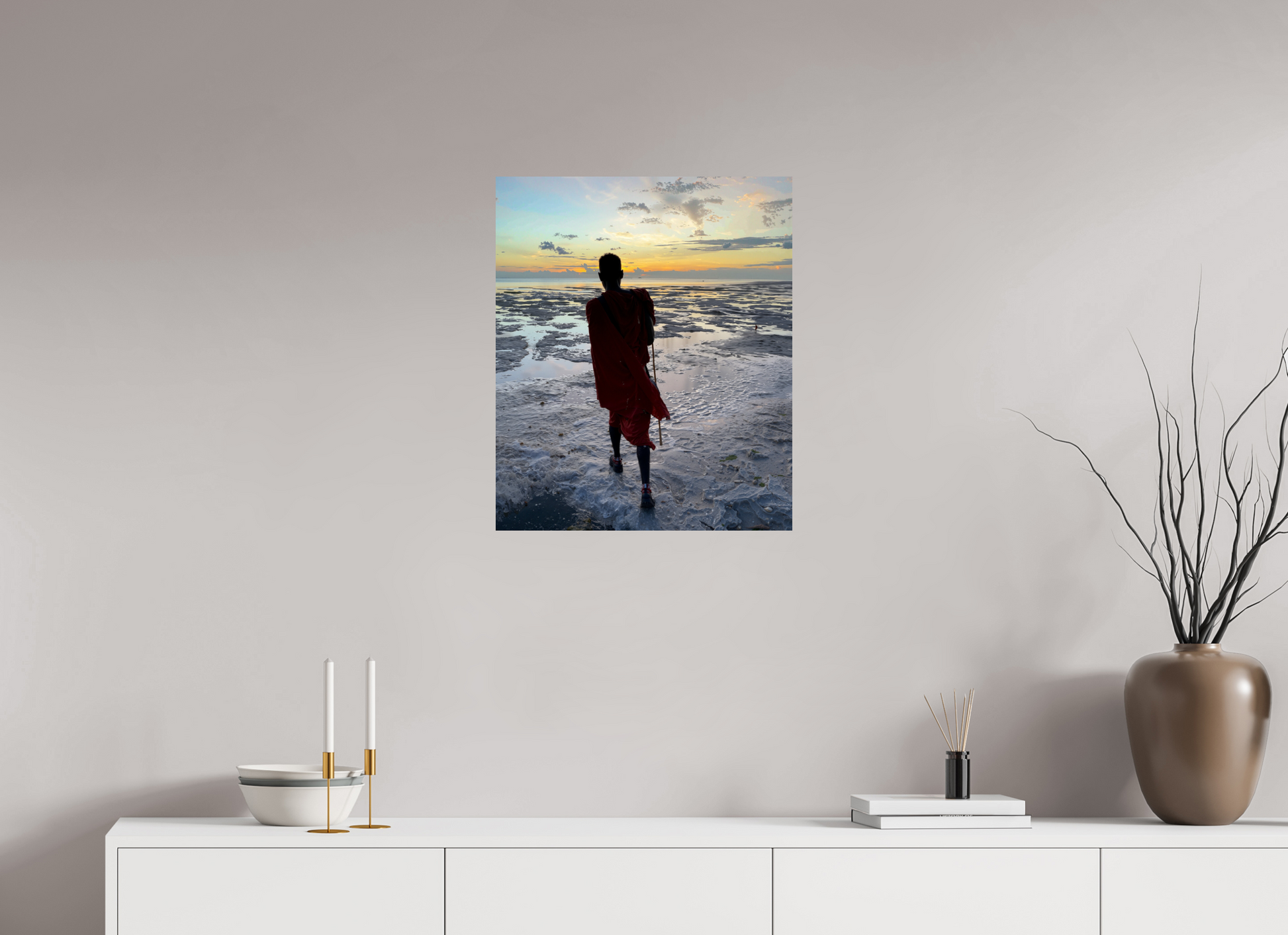 Captured on the Kenyan coast at dawn, this powerful image features a solitary Maasai figure walking into the quiet tide. Draped in deep red shuka cloth, silhouetted against the glow of morning light, the subject embodies a timeless rhythm—one of presence, legacy, and forward motion.